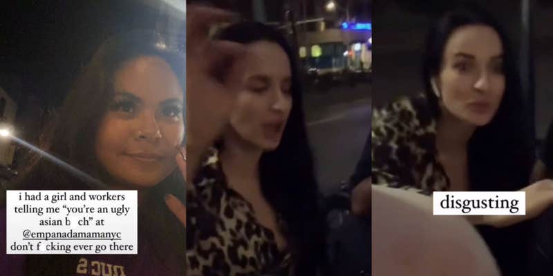 In a viral video uploaded Friday, a lady tells TikTok user @dennydoestiktok, or Denise, three times outside the New York City eatery Empanada Mama that "Asian bitches are ugly."