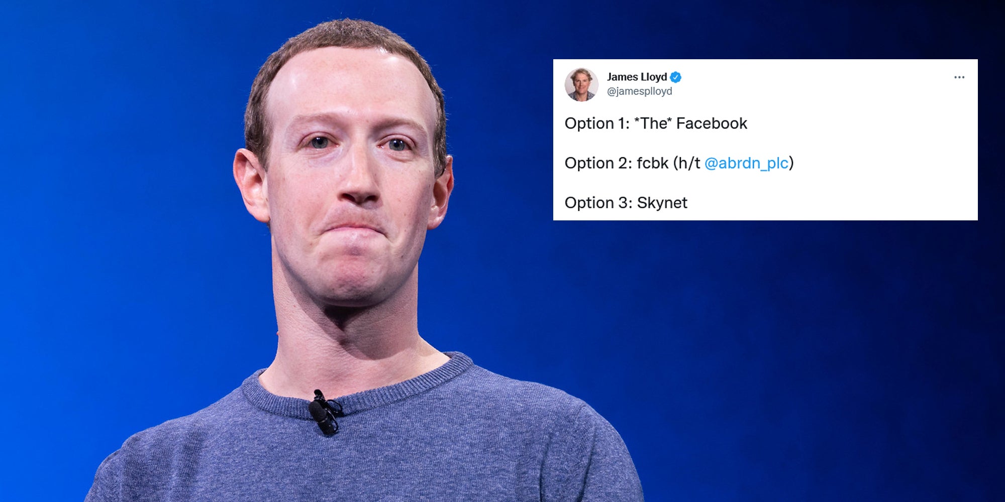 Facebook CEO Mark Zuckerberg next to a tweet mocking the reports that the company will go through a rebranding.