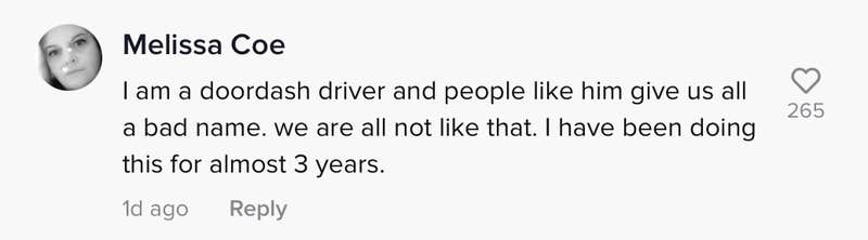 "I am a DoorDash driver and people like him give us all a bad name," one commenter wrote. "We are not all like that. I have been doing this for almost three years."