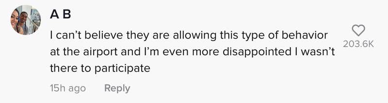 "I can't believe they are allowing this type of behavior at the airport and I'm even more disappointed I wasn't there to participate," the commenter wrote.
