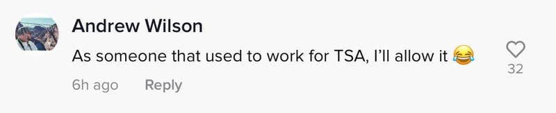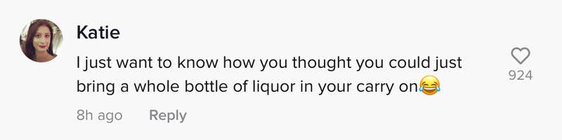 "I just want to know how you thought you could just bring a whole bottle of liquid in your carry on," the commenter wrote.