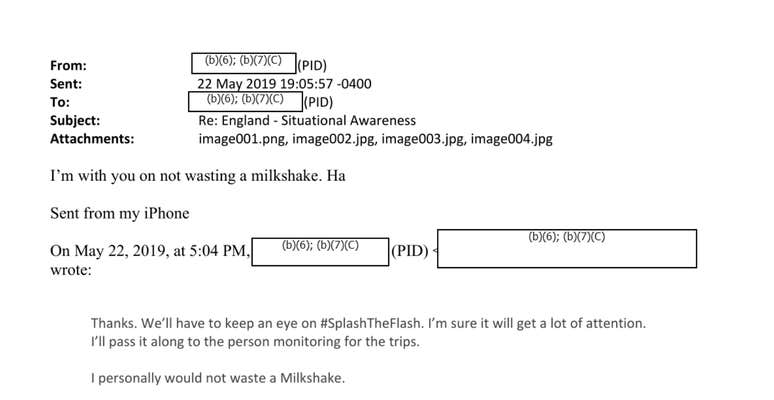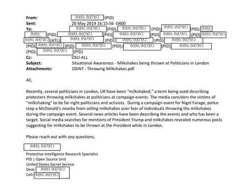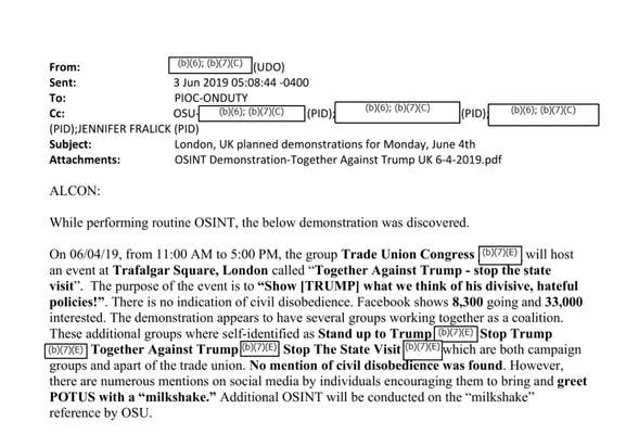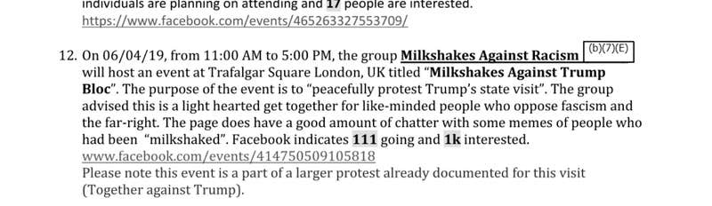 In emails about the upcoming demonstration for Trump's trip, an email noted there are "numerous mentions on social media by individuals encouraging them to bring and greet POTUS with a 'milkshake' Additional OSINT will be conducted on the 'milkshake' reference."