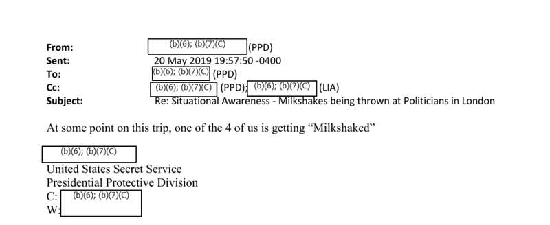 But, even for the lightheartedness in the emails, the Secret Service continued to monitor social media for comments about milkshaking in advance of Trump's trip.