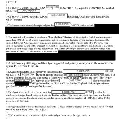 One particular tweet from the Secret Service, that appeared to be forwarded from the FBI, was of interest, prompting a search of that user's other social media, as well as an official report being filed.