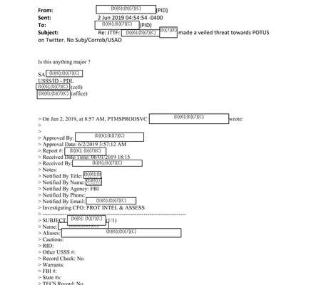 That email came from a protective research specialist with the Secret Service's Open Source Unit.
