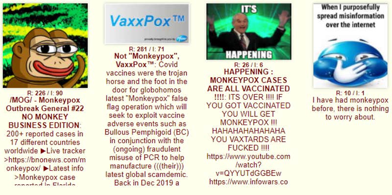 Anonymous users on 4chan are circulating this and other outlandish theories. Posts there claim it's a "false flag," "biological terrorism," or part of a conspiracy. Many of the theories are bigoted, blaming Jewish people, people of color, or sexual minorities for monkeypox.