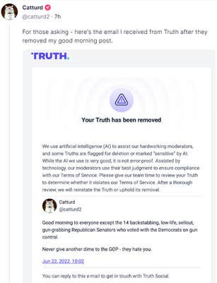On Wednesday, a prominent right-wing account posted a screenshot of an email from Truth Social explaining that it had removed their post. That post blasted the "14 backstabbing low-life, sellout, gun-grabbing Republican Senators who voted with the Democrats on gun control. Never give another dime to the GOP—they hate you."