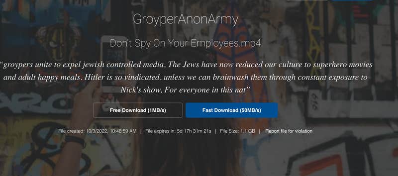 The link goes to a file hosting site, a page that appears to be run by someone alleging to be a Groyper, a group of young white nationalists.