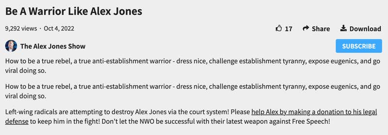 A link to the video has been posted into the text caption on videos on Alex Jones Banned. Video and Bitchute hosting platforms at least several times today, as well as added to the bio for the page for the Alex Jones Show on Banned.Video.