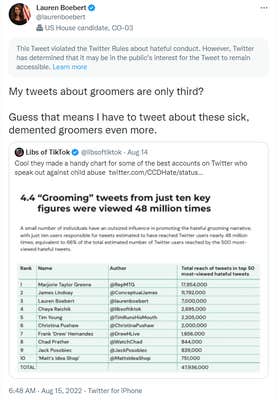 "Guess that means I have to tweet about these sick, demented groomers even more," Boebert added.