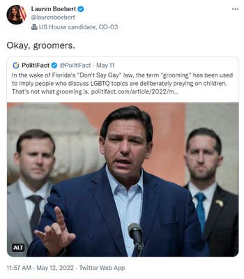 In May, Boebert replied, "Okay, groomers," to PolitiFact's tweet noting "the term 'grooming' has been used to imply people who discuss LGBTQ topics are deliberately preying on children. That's not what grooming is."