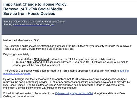 The Office of the Chief Administrative Officer reportedly sent an email notifying members and staff that they are prohibited from downloading TikTok. If they've already downloaded the app, the office said it will contact them to remove it.