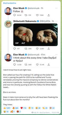 The conspiracy theorists were further convinced that Musk also believes that satanic, cannibalistic pedophiles control the world—the central tenet of QAnon—when he replied to someone posting a GIF of the red pill/blue pill scene from The Matrix by saying, "I think about this about this every time I take DayQuil or NyQuil."