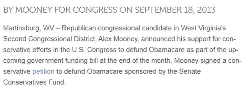 In a since-deleted post from September 2013, Mooney shared the news about how “proud” he was to sign a petition to defund and repeal Obamacare. You know, the legislation that allowed millions of Americans to get healthcare.