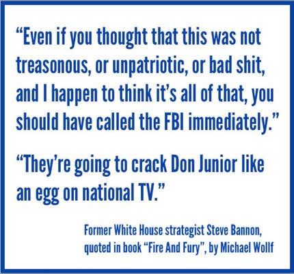 In addition to suggesting Trump ran a criminal enterprise, Wolff quoted Bannon saying of the infamous meeting in Trump Tower, “Even if you thought that this was not treasonous, or unpatriotic, or bad shit, and I happen to think it’s all of that, you should have called the FBI immediately.”