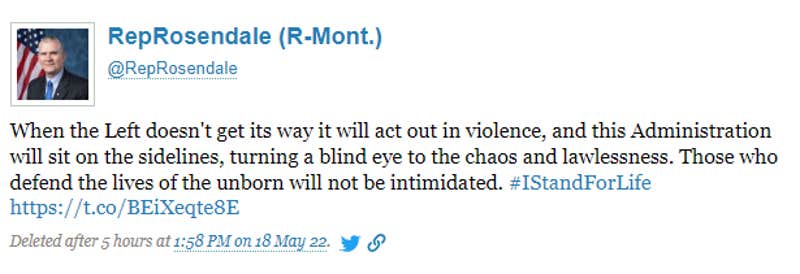 Probably because it prompted people to reply with photos of violence at the Capitol riot, Rosendale speaking at an Oath Keepers event, and comebacks like: “What would you call it when an administration ‘sits on the sidelines, turning a blind eye to the chaos and lawlessness’ of attacking the capitol because that administration lost, Mattie?”