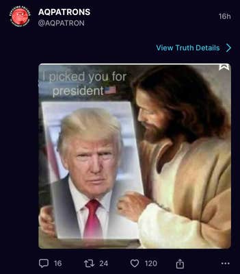 The post from Trump was quickly labeled as "trending" on Truth Social, where countless users flooded the former president's replies with other memes heralding him as being ordained by God.