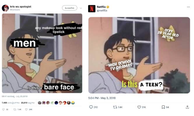The first referenced how much men notice—or don’t notice—when women are wearing makeup, and the other by Netflix, talked about the weirdness of casting actresses in their late twenties as teenagers. Each post garnered over 7,400 retweets. This sparked renewed, massive interest, this time not just on Tumblr but also Twitter and Reddit.