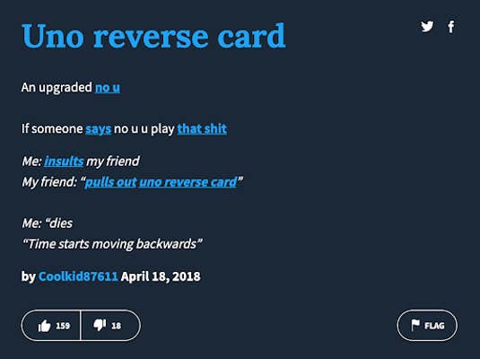 In April of 2018, an Urban Dictionary user defined the term “Uno reverse card” as “An upgraded no u.”