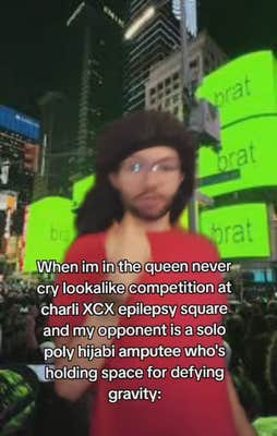 With the advent of the Queen Never Cry meme, you might see statements along the lines of "me when I’m a solo poly black amputee houseless hijabi at the epilepsy brat themed times square trying to hold space for defying gravity and queer media but then i tell myself queen never cry."
